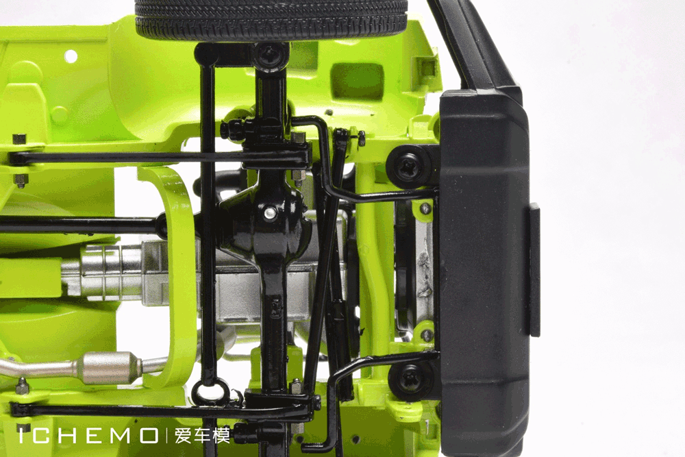 模型用避震弹簧作为连接车轴和车架的主要结构,整体重量基本由弹簧承担,如此一来模型车身姿态就能像真车一样,在较复杂平面上保持四轮着地。当然,模型也有接近/离去角的极限。值得注意的是,不知长时间陈列会不会造成悬挂形变,建议玩家适时保养维护或者回盒收藏。