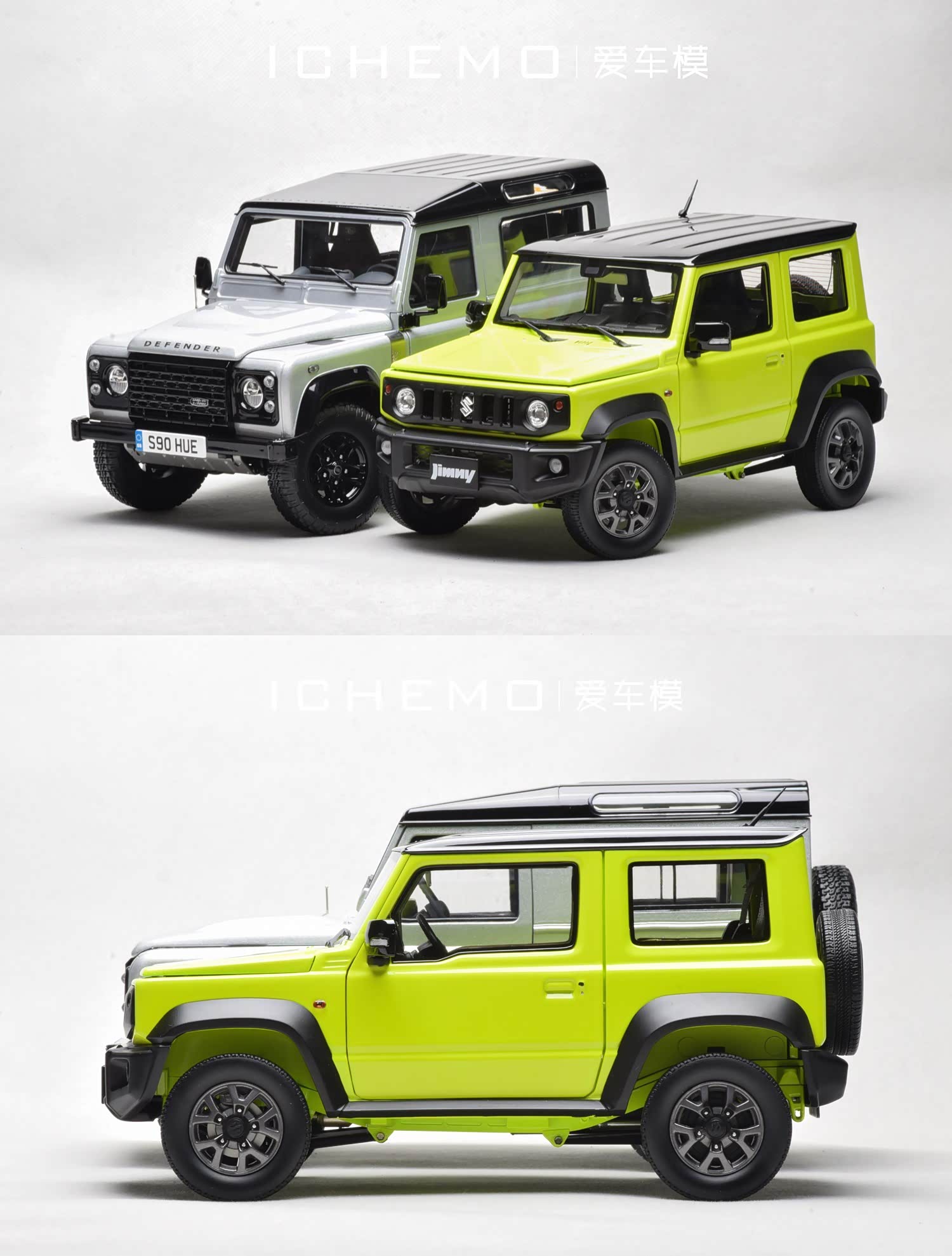 模型采用了纸盒 + 泡沫盒的包装方式,整个模型的包装体积很小,泡沫盒没有设计固定模型本体的螺丝,这在一定程度上简化了模型的收取过程。开箱机器人个人很喜欢这样小巧的包装,但这并不只是因为 Jimny 本来就很小。下图为与 Almost Real 似真模型 1:18 路虎卫士 D90 汽车模型的对比 - 如果两者的模型比例没有过分误差的话(且忽略近大远小) - 可以发现 Jimny 不比 Defender 小多少。另注:模型包装盒上有 Suzuki 铃木官方授权信息标识。