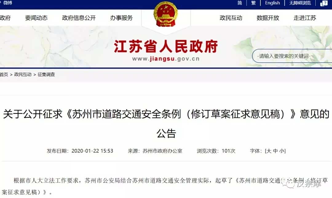 《公告》称“为进一步增强立法的公开性和透明度,提高立法质量,现将《苏州市道路交通安全条例(修订草案征求意见稿)》向社会各界公开征求意见”,在征求意见截止日期2020年2月22日之前,公众可以向苏州市公安局提出修改意见: