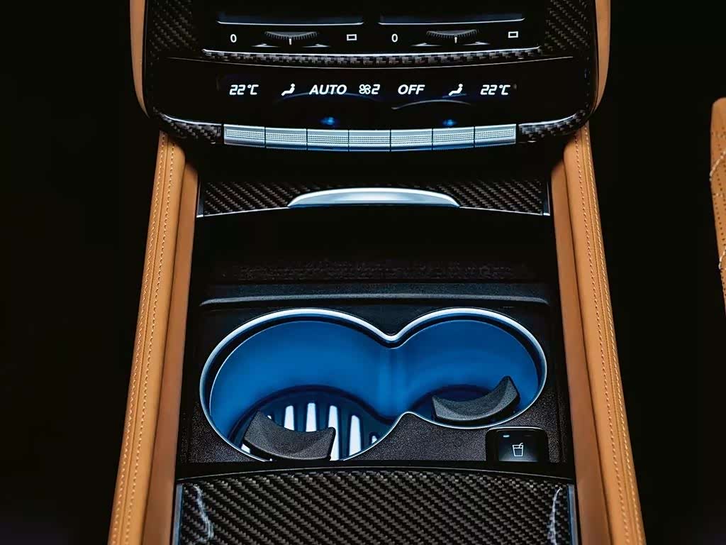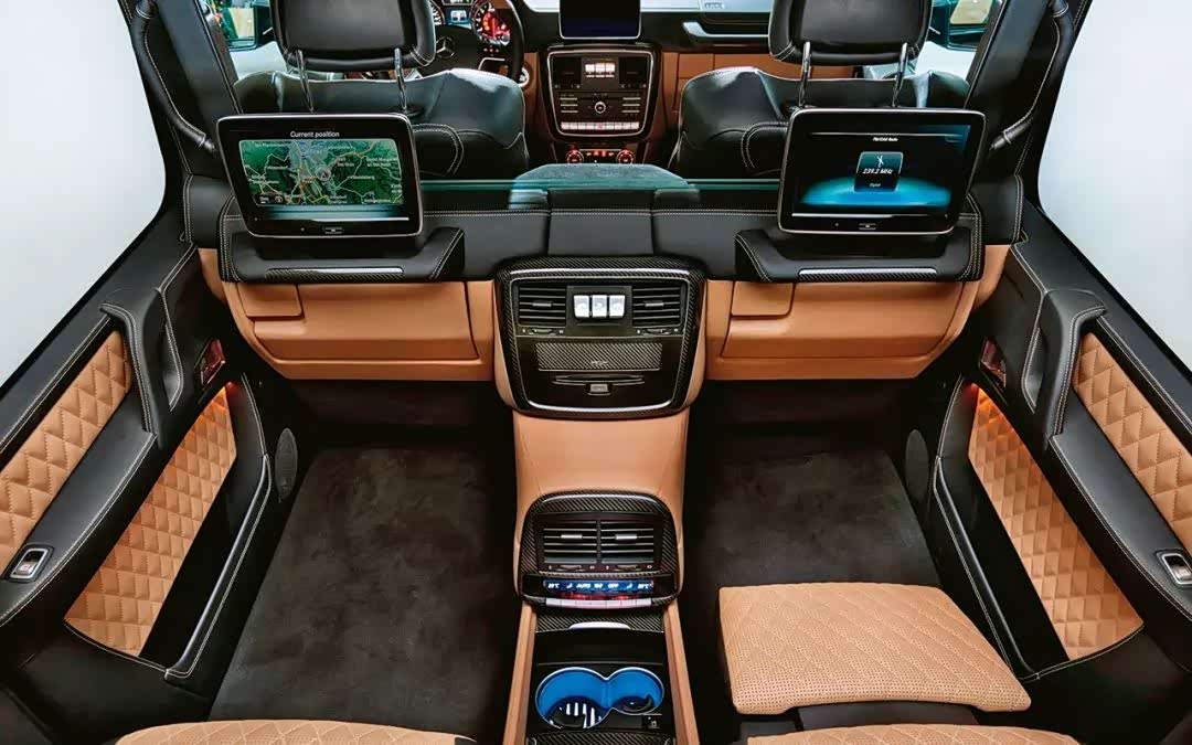 G650 Landaulet 的内饰运用黑/米双配色,在中控台门饰板、方向盘及座椅等部位大量采用真皮材质包裹,营造十足的奢华感受。而后座受益于加长轴距,带来巨大脚步空间,同时 B 柱的位置增加了中控台,并装配两台液晶屏幕,由玻璃与前排隔离形成独立的空间。