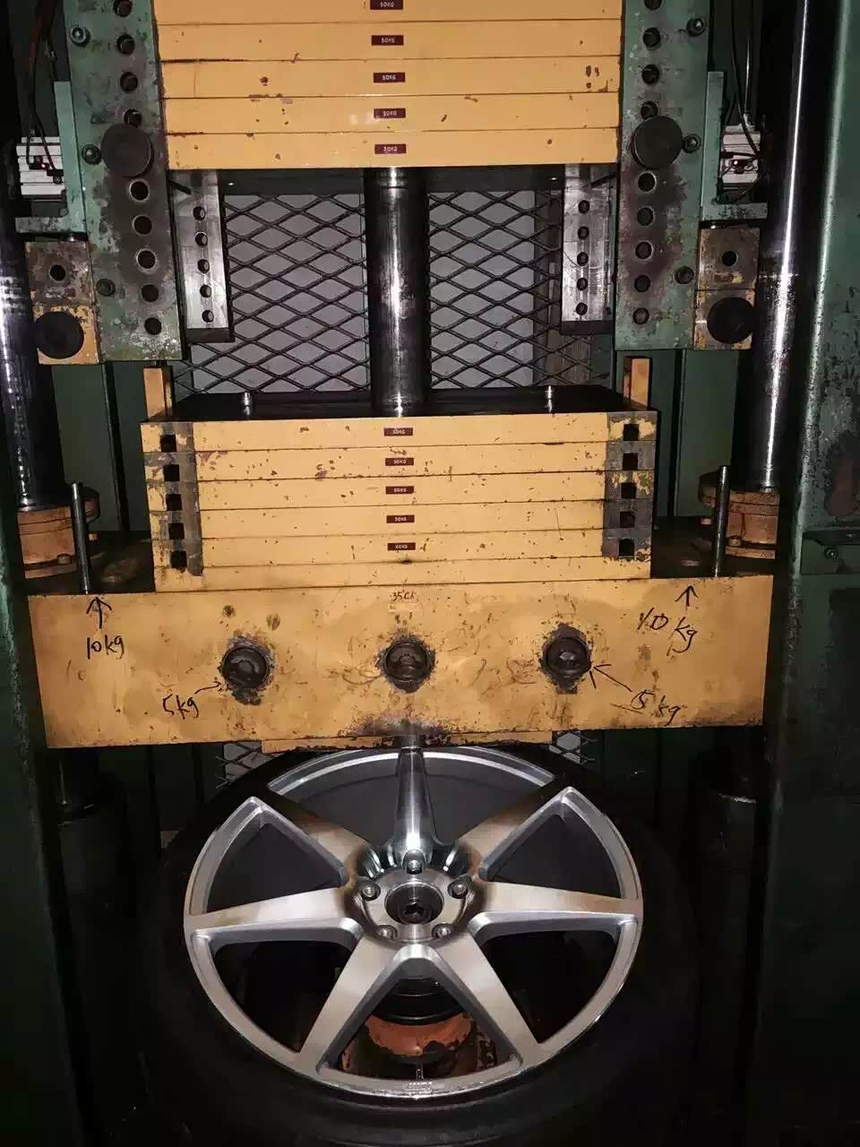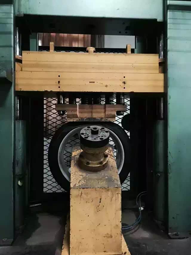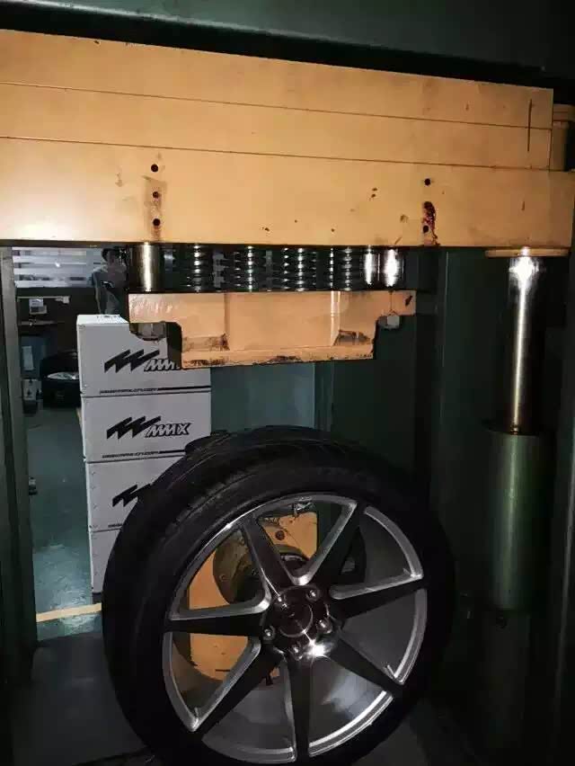 无论是出于车辆操控提升或是视觉美观,无论是原厂还是改装的轮毂有越来越大的趋势,这样轮胎的扁平比相对随之降低,扁平比低的轮胎可缓冲空间也会随之下降,车辆驾驶在凹凸不平的路面时,轮胎过滤的震动减少,震动甚至是路面的冲击直接传达轮毂,因此对轮毂的搞冲击能力要求越来越高。而且很多用户是不能及时的发现轮毂的微量变形的,这样使用会存在一定的安全隐患。为了相对提高轮毂的耐疲劳度和冲击性能,MMX除了轮辋的强化工作外,还专门针对轮辋的变形设置了更为严苛的安全检验项目“变形径向试验”。原理:先是用90度冲击台架,锤重1000KG作为冲击使轮辋出现小量变形的情况下,再用径向负载耐久试验做径向500000循环转考验轮辋的强度。
