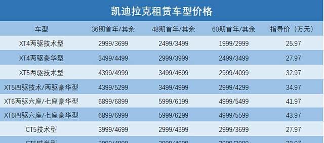 此次参与租啦计划的车型共计5款,分别为CT5、CT6、XT4、XT5、XT6。每款车型提供两个配置车型,基本都是低配和次低配。消费者根据不同车型和租赁时长,缴纳不同的租金,最低月租为1999元。租约到期后,消费者可有续租、退还、换租、回购等选择。