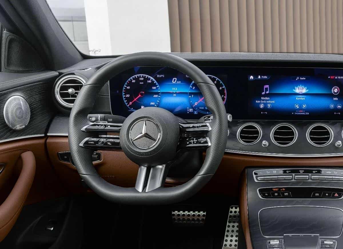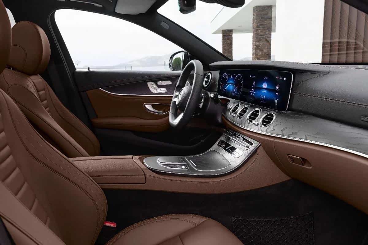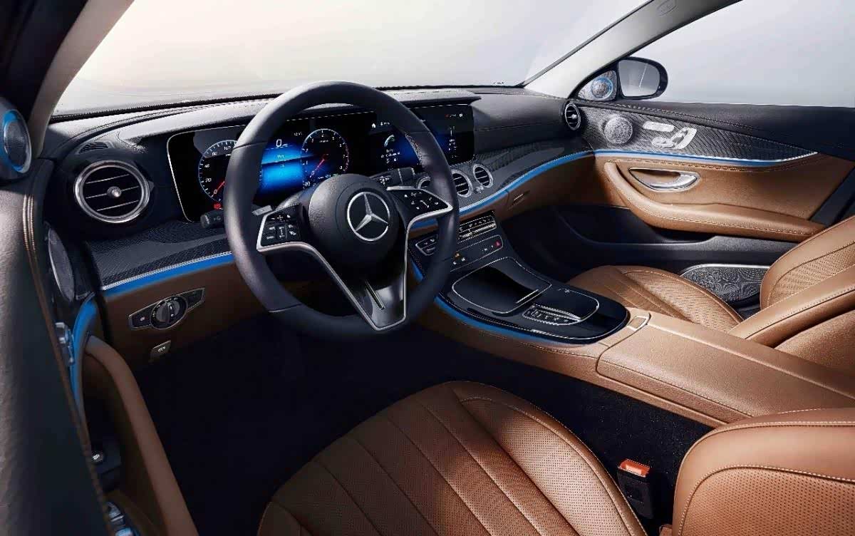 在内饰上,新一代E级车内饰在传承E级车的豪华基因同时,更添诸多智能科技。全新方向盘设计更为先进,其触控板采用了电容传感技术,驾驶员只需以指尖轻滑触控板,如同操控智能手机一般,就能控制仪表盘和多媒体显示屏。双12.3英寸高清显示屏拥有可触摸的中央显示屏,带来巨幕影院般的视觉效果。但全新的方向盘在整个内饰中非常显眼,运动型的三条幅方向盘在3点和9点钟位置使用了四条全触控条幅,没有任何实体按键,用来控制仪表盘与中控显示屏的显示以及车机系统的设置。除了运动化风格变动较大之外,内饰也与当下A级有着相似之处,譬如说更替为液晶显示屏的中控屏幕以及仪表盘,这意味着在技术科技路线方面,奔驰也在做出更替。