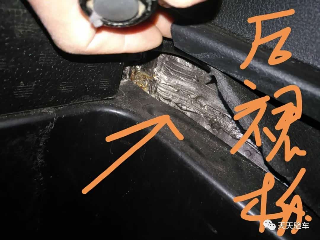在看看后备箱,揭开后裙板护板,焊接痕迹,新打的密封胶痕迹明显,并且做工非常粗糙