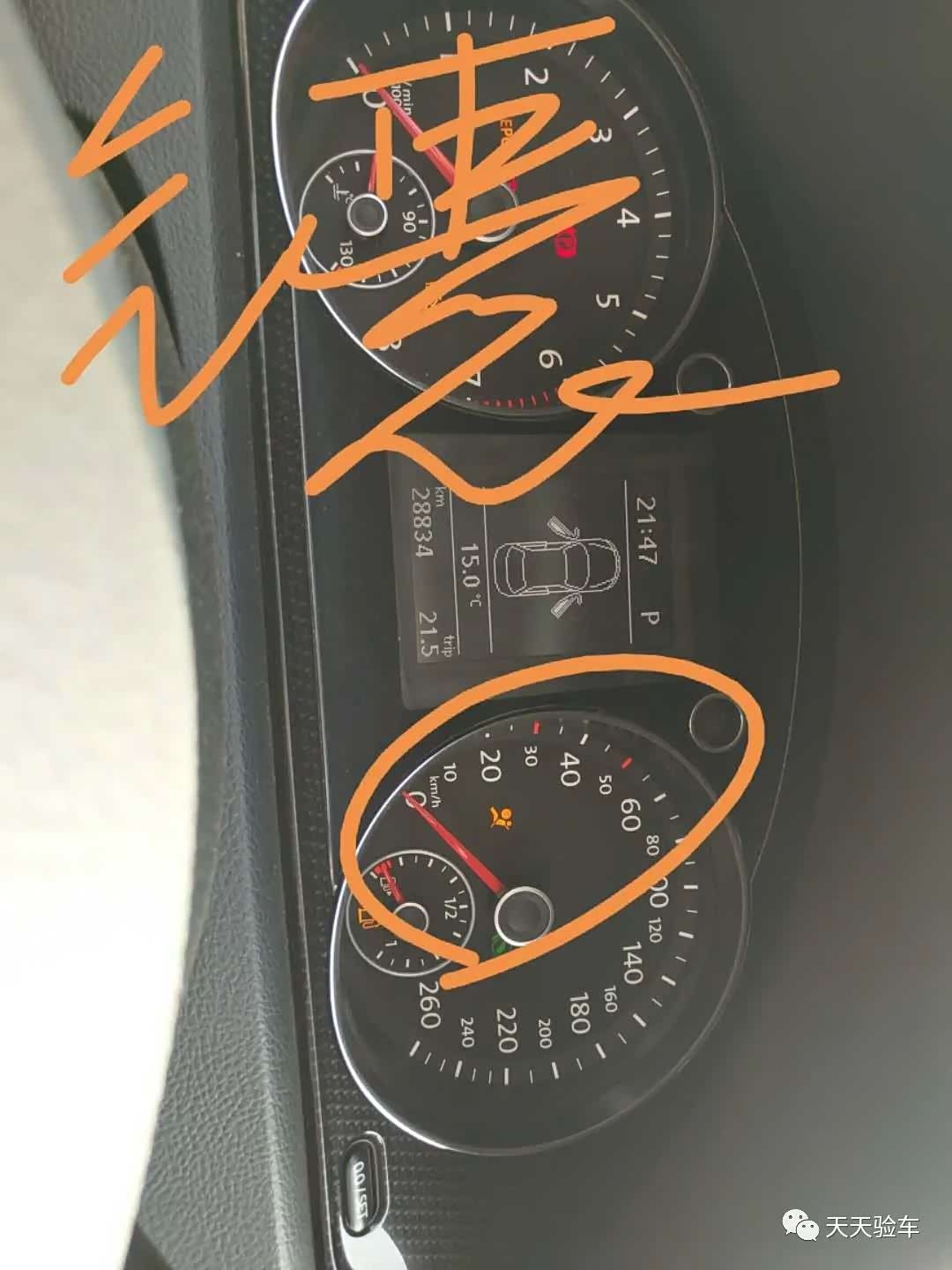 先看仪表,气囊灯是亮的,正常情况下,汽车打开点火开关车辆系统会自检,一些故障指示灯会亮,自检后会逐步熄灭,当然有些是亮着的如电瓶灯,但是车辆一旦启动所有的故障灯都应该熄灭,如果有亮的的,就说明车辆是有故障的,当然安全带指示灯、手刹指示灯必须等待相应操作之后才会熄灭