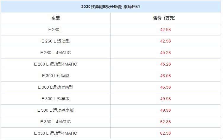 日前,2020款奔驰E级长轴距版正式上市。新车推出包括立标和运动轿车在内的共计10款车型,指导价依旧为42.98-62.38万元。由于是年度改款,新车主要针对部分车型配置进行调整,同时老款的E 300 L豪华型和运动豪华型分别更名为E 300 L殊享版/运动殊享版。