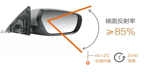 DPA大众系列倒车镜镜片在60±2℃水温环境和92%至100%的湿度环境下,历经2小时实验,镜面反射率依然为实验前的85%以上。