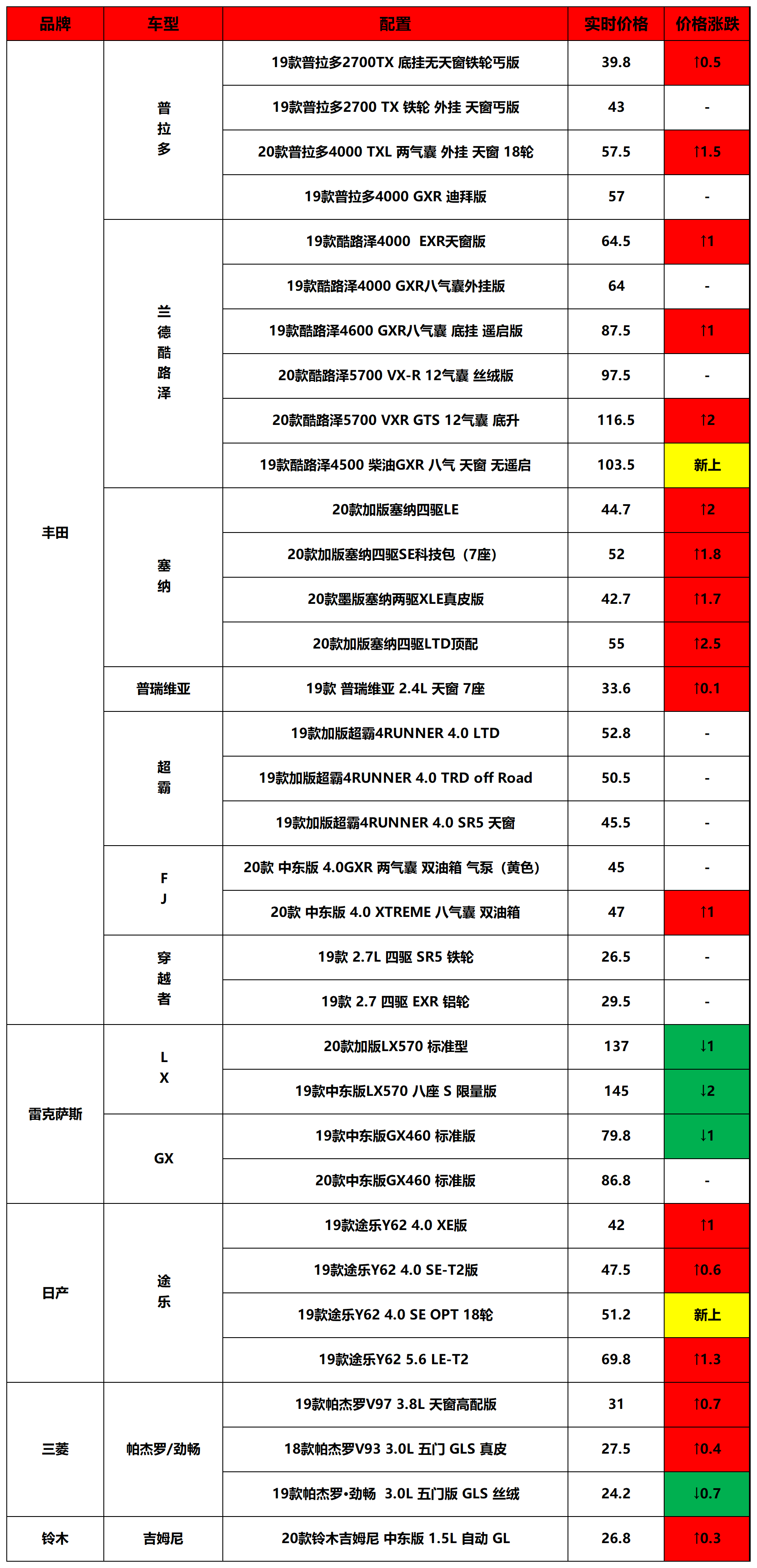 本周热门日系车的价格波动很大,集中出现在这两天。普拉多2700价格小涨但全系不推荐,没有性价比;普拉多4000的价格相对稳定,主推GXR迪拜版本的价格也没有波动,主动推荐;兰德酷路泽作为平行进口的“销冠”自然也是涨价的排头兵,1-2万的涨幅确实有些不合理;不过要说不合理,塞纳的不合理要排第一,作为一款我一直主动推荐的车型,塞纳这次的涨价让我感到惊讶又失望,那么大的库存支撑得住将近3万的涨幅吗?我猜本家一定是疯了!还不趁这一波利好政策消化库存,反倒在这里作怪,真的是活该你积压!其他一些丰田车型的价格波动不大,不热门的车型哪有底气涨价,您说是吗?雷克萨斯LX和GX的表现很明智,价格的下调随之而来的是我主动的推荐。