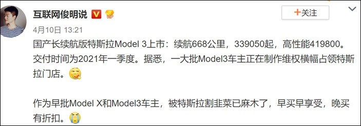 最近特斯拉也干了一件这样的「损事」。本来Model 3国产,就已经让那些四五十万入手进口版的车主心里酸溜溜了,后来连续两次降价,不到30万就能入手Model 3让那些先吃螃蟹的进口车主也忍了。