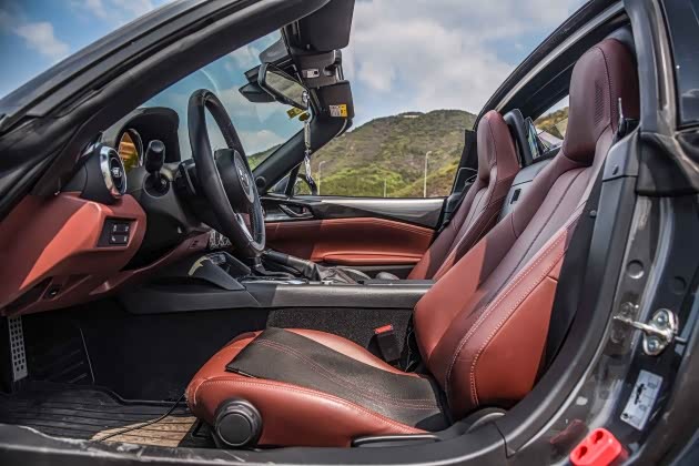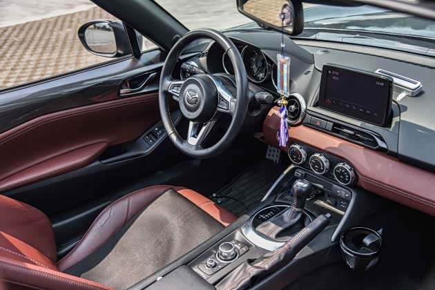 虽然MX-5在运动感的营造上比BRZ差了很多,但MX-5有一个天生的优点,那就是能敞篷。不过眼前这台硬顶版的车型在造型上我个人认为不如软顶版的更加协调,这主要是因为硬顶版的C柱太过于高耸,配合上小巧的车身,那种感觉就像是小孩带着大人的头盔。但软顶你买不到,所以这问题咱们就过了。