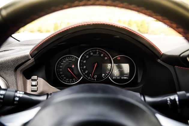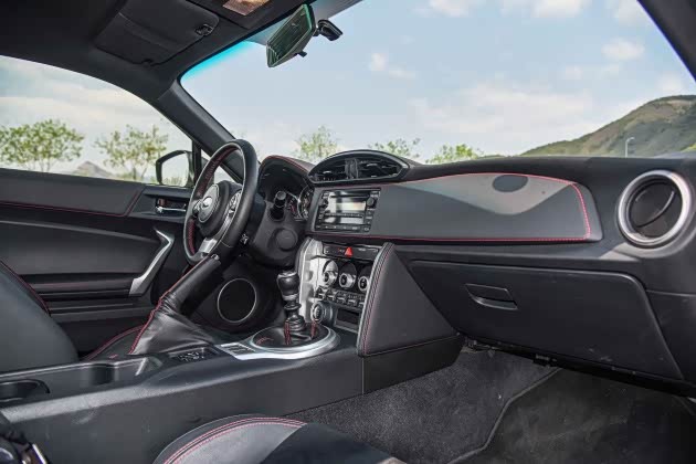 坐进驾驶舱,BRZ的驾驶氛围几乎是满分的表现,就连超跑都不输。我们常用坐着就能在地上撵烟头来形容坐姿低,BRZ就能完美的完成这一动作。接下来方向盘、转速表、换挡杆、手刹、电子系统控制按键,这些东西都能给你完美的驾驶参与感。我几乎是坐进BRZ的瞬间,就想马上挂一档抬离合松手刹,然后一个定圆画起来。但BRZ的内饰做工并不能让人满意,毕竟这台车落地要30万,但你发现你花了30万之后却得到了一个跟飞度一样水准的内饰工艺,甚至连一块彩色显示屏都成了奢求。