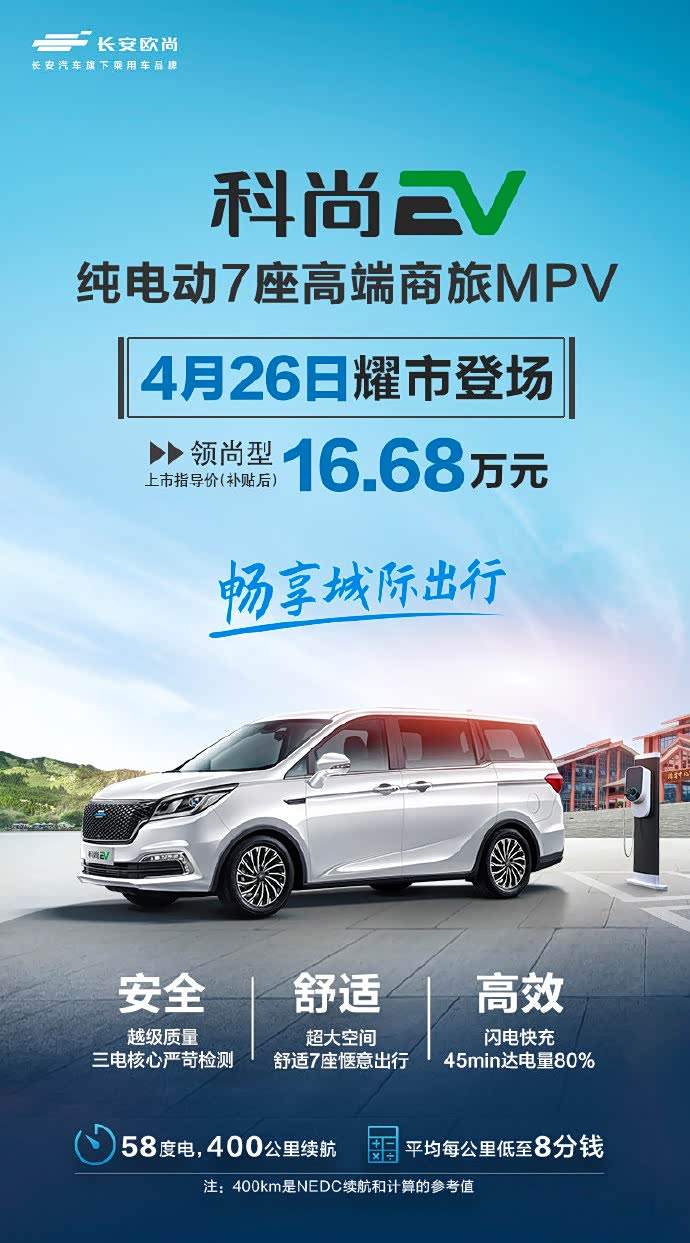 科尚EV是欧尚旗下的首款全新纯电动MPV,新车的补贴后售价为16.68万元。
