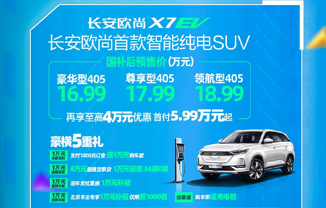 此外,长安欧尚X7 EV也开启了预售,补贴后的预售价为16.99万-18.99万元。