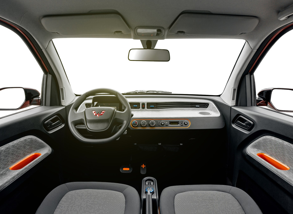 车辆内饰非常简约,毕竟整个车的空间本来就不大,而且硬塞进4个独立座椅,所以为了大幅度提升空间体验,并没有配备中央扶手箱,而且中控台面的造型也是在为空间服务。不过内饰设计感确实很到位,驾驶员前方配备了黑白液晶仪表,台面上还有大量的鲜艳颜色装饰,就连油门刹车踏板上都有加减号装饰,简直就像一台大玩具。