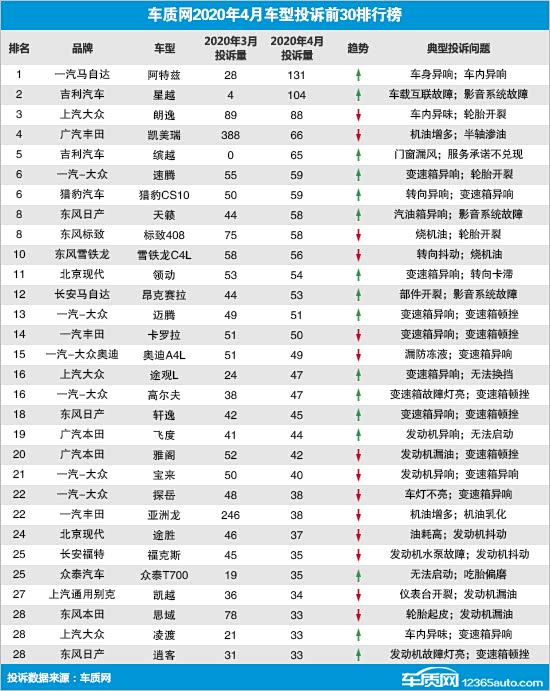据车质网统计,4月份共接收到车主有效投诉信息7,605宗,环比下降7.7%,同比则上涨8.4%。数据显示,本月车质网接到的有效投诉信息共涉及657款车型,其中投诉达两位数(含)以上的车型135款。此外,本月车质网共接到车企针对投诉的回复8,665条(含部分2020年3月份投诉的回复)。在去除投诉人因为车企解决得当而自愿申请撤诉的信息后,2020年4月投诉量前30的车系(车型)排名如下: