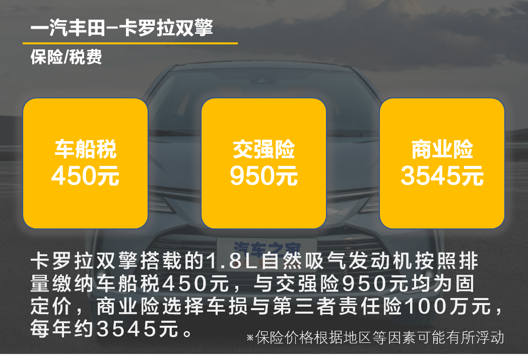 卡罗拉双擎搭载的动力系统由一台53kW的电机与一台最高功率72kW的1.8L排量的自然吸气发动机组成,由于不是双擎E+那样的插电式混动,车船税不能免征,按照排量来划分,每年450元。另外保险方面,交强险为强制购买,6座以下的家用车每年950元;商业险部分我们选择最基础的车损险与第三者责任险100万元额度。