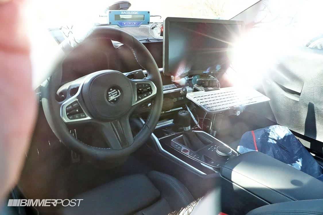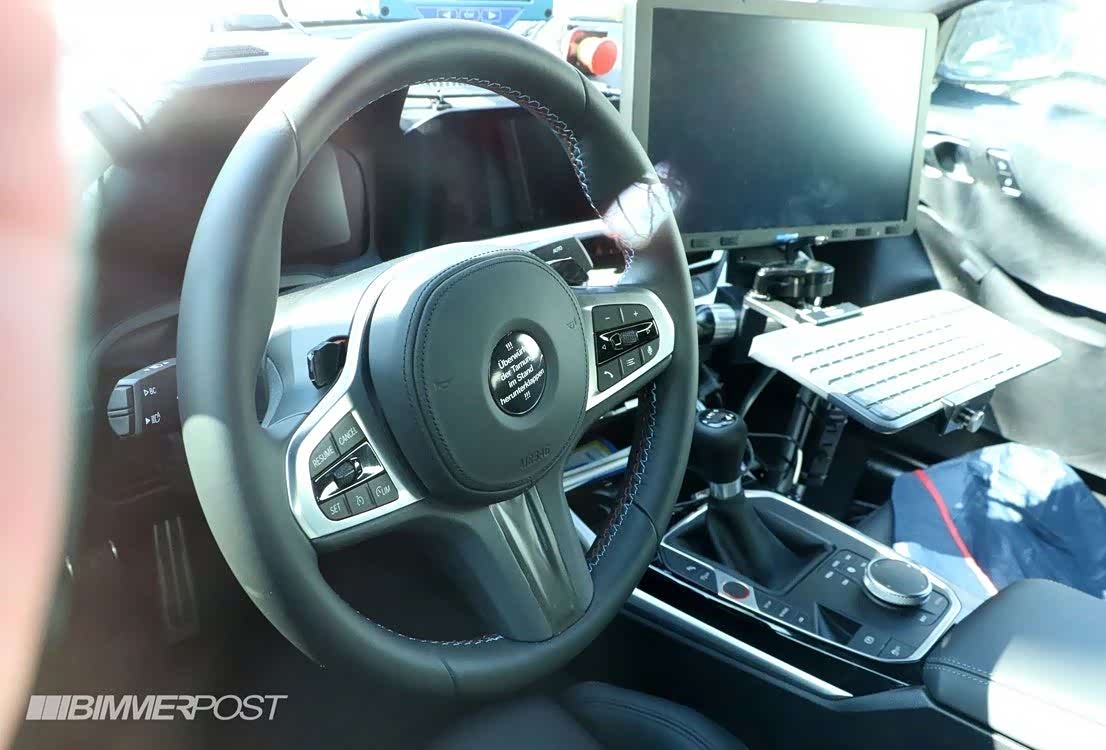 G82 M4路试车的内饰已经差不多完全裸露了,方向盘的样式大家都比较熟悉,看起来和目前最新M家族成员一致。双液晶屏幕和全新M仪表显示是必须的,这台路试车是手动版本(并不会引进国内),在这个年代还能为大马力后驱车提供手动版本,真是难能可贵啊!