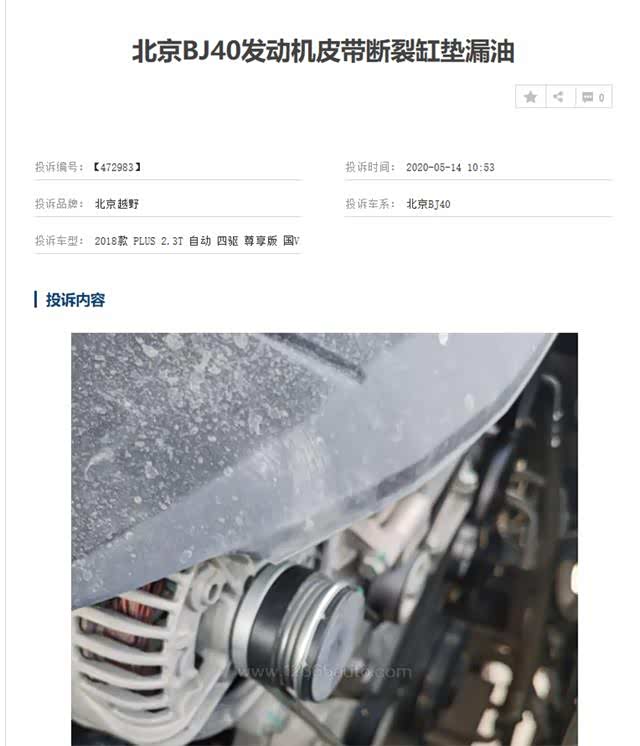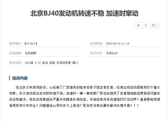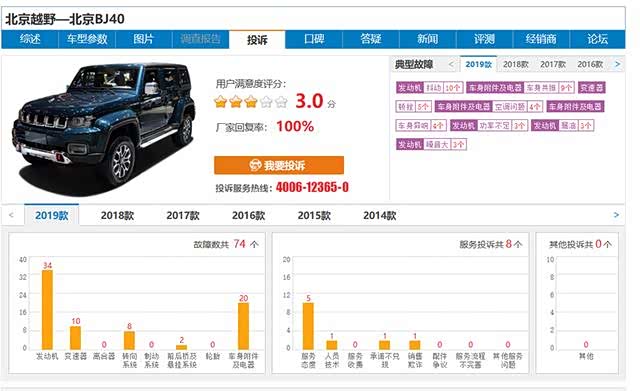 我们从车质网发现BJ40的投诉评分为3.0分,主要问题为发动机故障报警灯闪烁、发动机异响、发动机抖动等,而作为汽车核心部件之一的发动机成为了北京BJ40车主重点投诉对象。