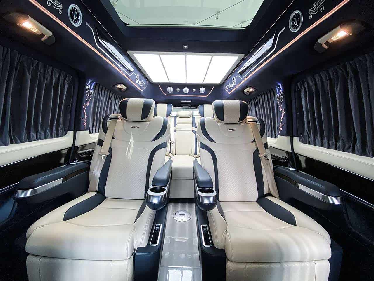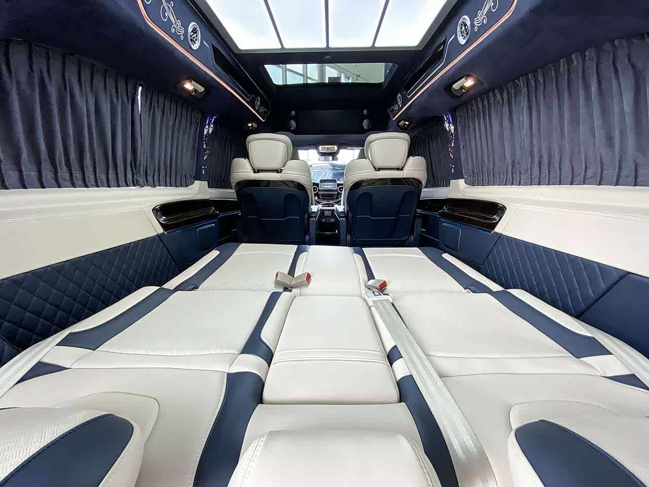 奔驰V260L巴塞罗娜是奔驰商务车中排座椅转过来后可以形成小型会议室布局,中间有张隐藏式办公桌板瞬间满足会议使用需求,在平时还可以拼成一张简单双人床,这样也可以满足不同人群在旅途中休息需要,这是一款多功能商务房车,车辆上半部分配有进口阿尔坎塔拉皮绒,整体效果更加清新,时尚。