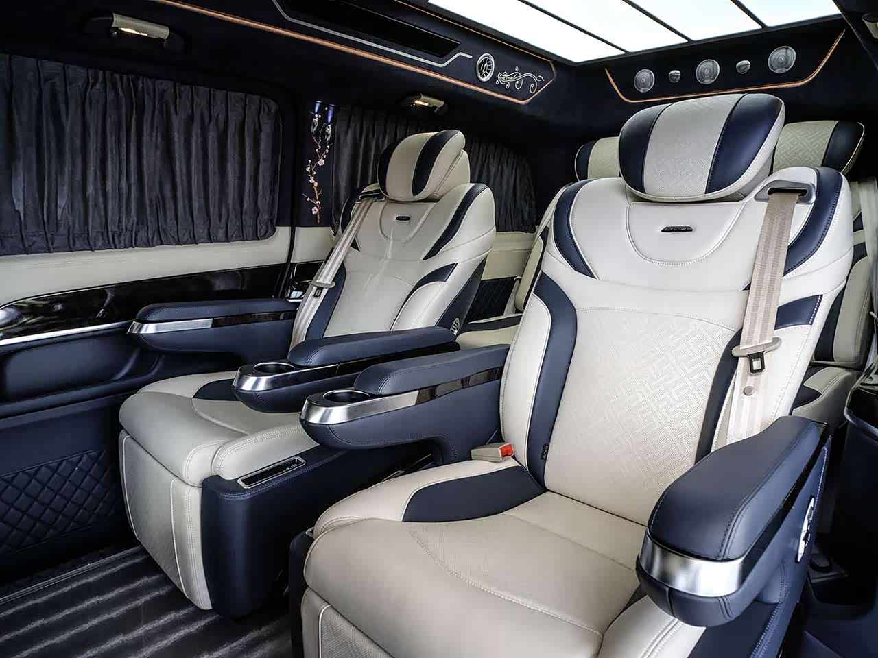 奔驰V260L巴塞罗娜中排奢华航空座椅带有360度旋转多达14项调节功能(按摩5项、腰托4项、通风、加热、记忆3项、还有7种颜色氛围灯等),以及170°符合人体工程学设计能使您更有效的解除舟车劳顿。是商务车上少有配置。乘坐舒适性和安全性是同类车型里最高。