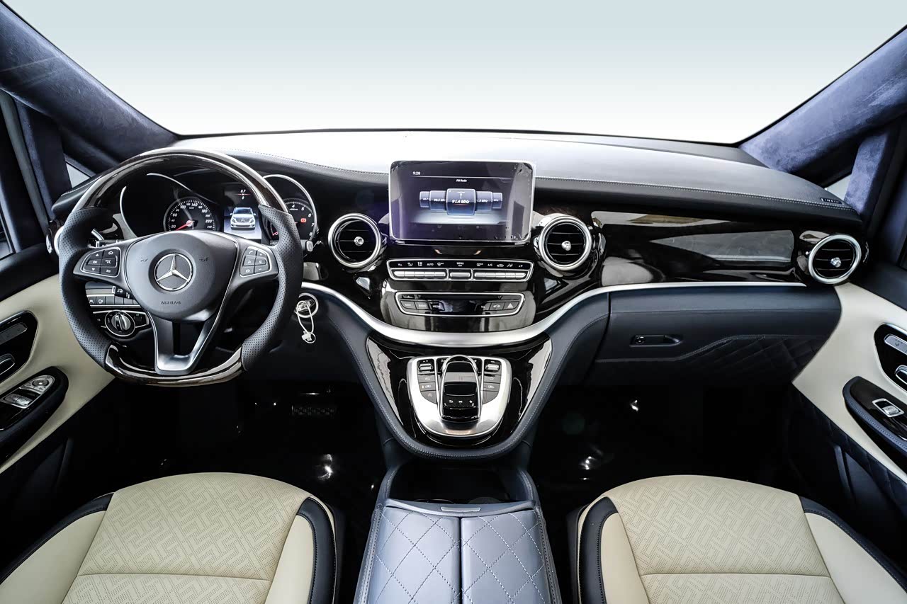 奔驰V260L巴塞罗娜版驾驶室是根据奔驰最新S级内饰设计,整体感更加先进和时尚,运动类方向盘让一台颜值较高商务车更加具有驾驶操控乐趣,多功能方向盘、换挡拨片、配有7速自动怀挡变速箱、8.4英寸多媒体导航屏同时还有多达4种驾驶模式(运动、经济、舒适、手动)让整车配置更加丰富。