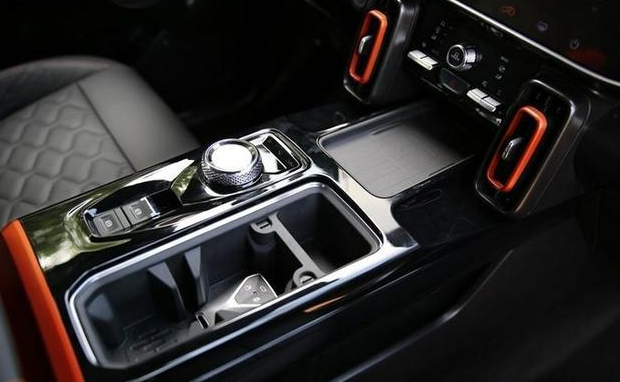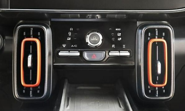 内饰各个模块的处理个性十足,中控搭载一款大尺寸液晶显示屏,左侧棱角分明, 右侧采用半圆弧设计,在之前的车型上都没有见到过。下方空调出风口采用竖状造型,上方带有红色饰条点缀,显得十分年轻化。