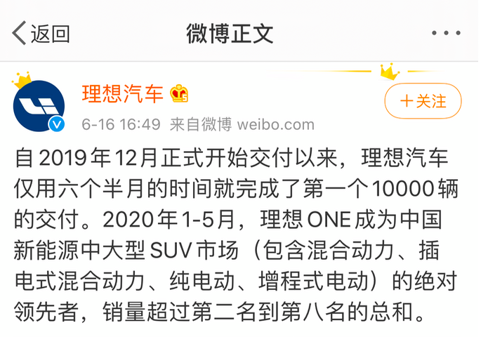 2020年6月16日,理想汽车发布官博称:自2019年12月正式交付以来,理想汽车仅用六个半月就完成了第一个10000辆的交付。同时,文章的标题为:每10000辆 理想ONE(参数|询价)交付,创下造车新势力最快交付万辆记录。