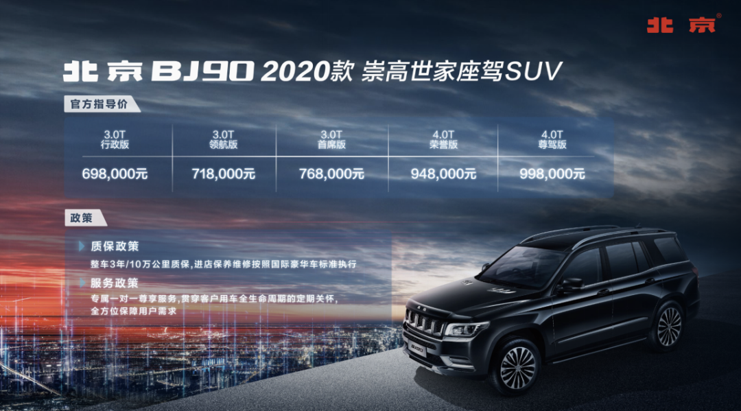 除此之外,北京BJ90 2020款用户还将享受专属一对一尊享服务,包括进店保养维修均按照国际豪华车标准执行,整车3年/10万公里质保。