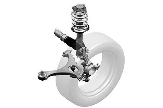 麦弗逊式悬挂由螺旋弹簧、减震器、三角形下摆臂组成,绝大部分车型还会加上横向稳定杆。主要结构简单的来说就是螺旋弹簧套在减震器上组成,减震器可以避免螺旋弹簧受力时向前、后、左、右偏移的现象,限制弹簧只能作上下方向的振动,并可以用减震器的行程长短及松紧,来设定悬挂的软硬及性能。