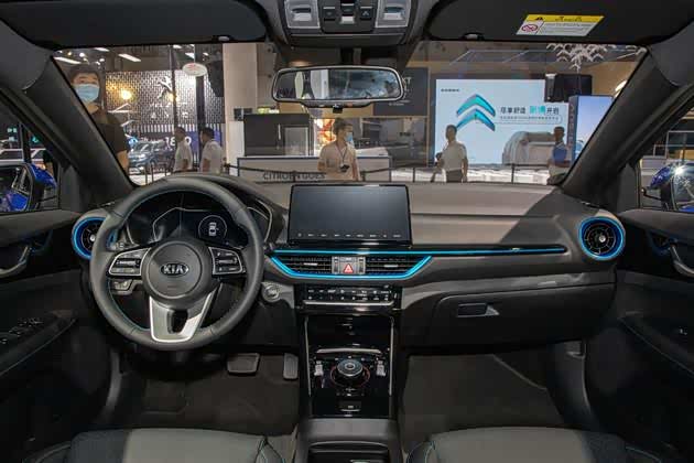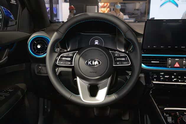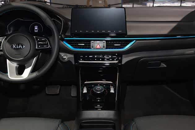 内饰部分,起亚K3纯电动车在内饰布局、颜色搭配上基本与K3 PHEV车型一致,中控台面板、空调出风口外圈等细节上采用了蓝色的装饰条,以彰显其新能源车身份。展车同样搭载了10.25英寸多媒体触控屏,与燃油版、PHEV版车型一致。