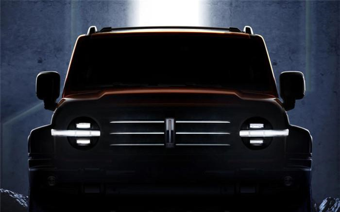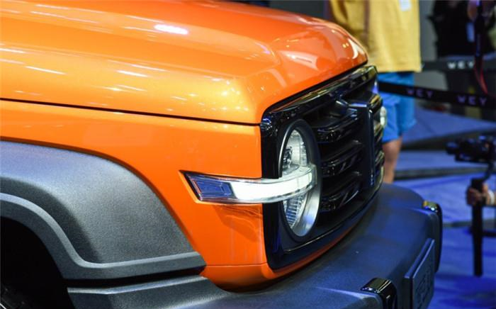 从正面来看,平直方正的车头,黑色高亮饰条与左右圆形大灯完美结合在了一起,并且灯组内部使用了全LED光源,另外突出的保险杠增加了它的野性,但粗犷并不粗糙,保险杠上面的圆形雾灯还是很小巧精致的,上面还设计了亮黑色的小方块,应该里面会是拖车钩。
