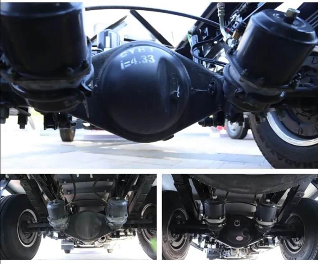 青春版采用四轮鼓式气压制动,标配威伯科ABS刹车防抱死系统,后桥为4.5吨级,主减速比为4.875,轮胎采用700R16真空胎;青春飞扬版和青春Plus采用前盘后鼓式气压制动,ABS刹车防抱死系统同样是威伯科的产品,后桥为6吨级,主减速比同为4.875,青春Plus采用750R16真空胎。另外,三款车型均配备制动间隙自调功能。