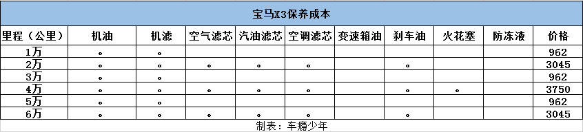 车辆的具体保养费用,可能会根据各地情况和车辆的实际车况而有所不同,以上图作为参考,宝马X3行驶60000公里的保养费用大约为1.27万元左右,按照一年2万公里计算,平均每年的保养费用为4200元左右。