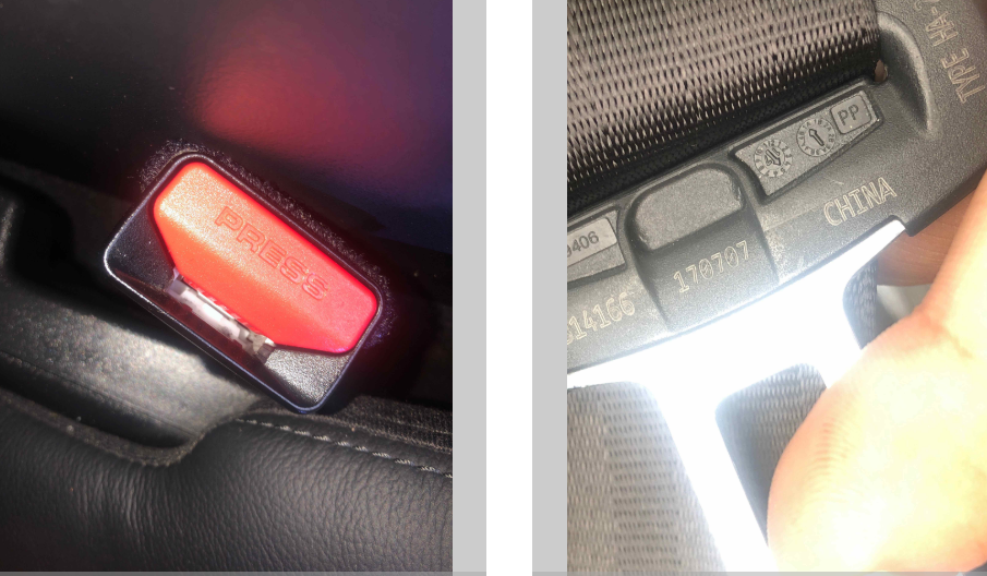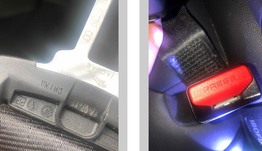 安全带卡槽没有水泡痕迹,安全带检测生产日期与车辆出厂日期基本符合,没有更换拆卸的痕迹,看到China字样了嘛,没错,这台大捷豹是国产的。