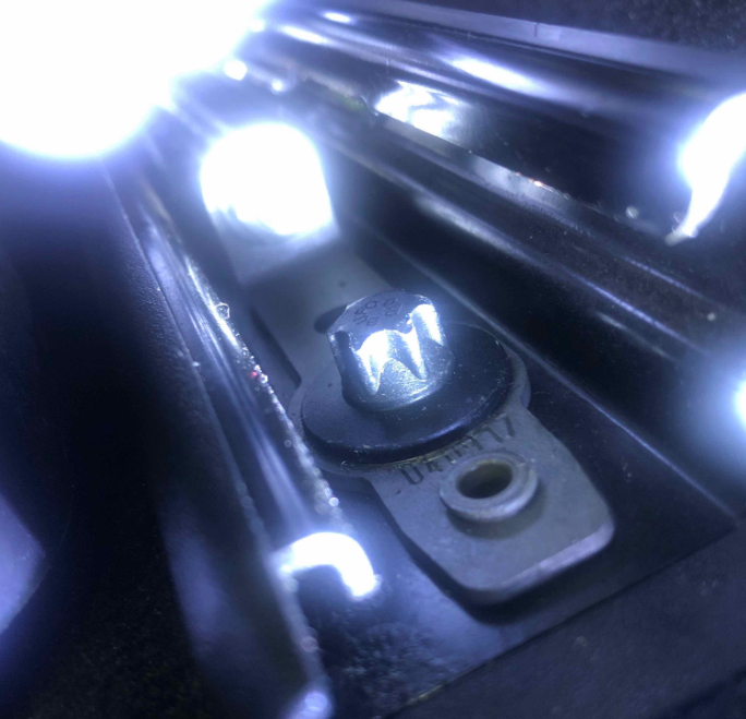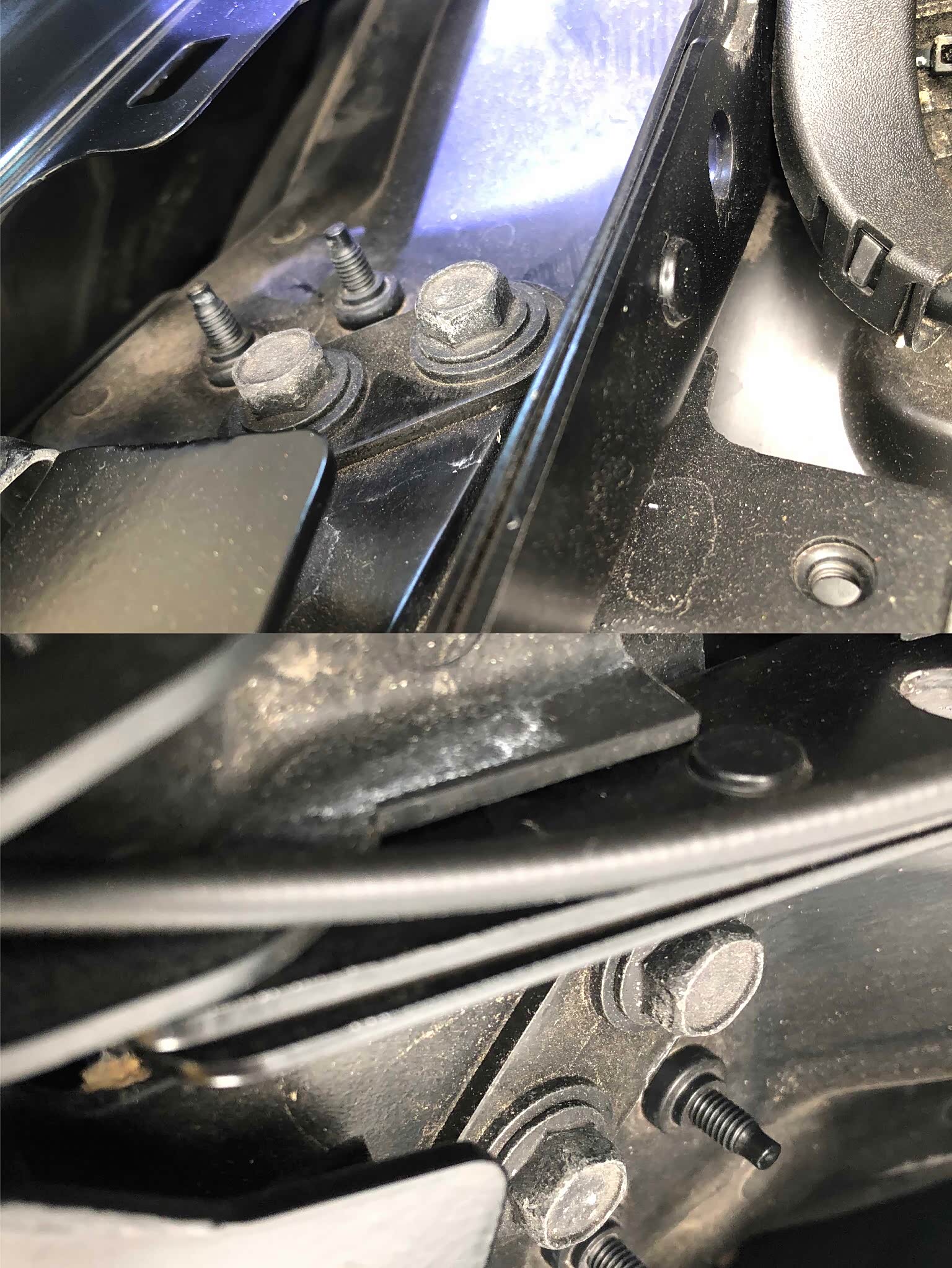 检测两侧水箱框架螺丝没有拆卸修复痕迹,检测到这里基本可以排除车辆前部有过碰撞。