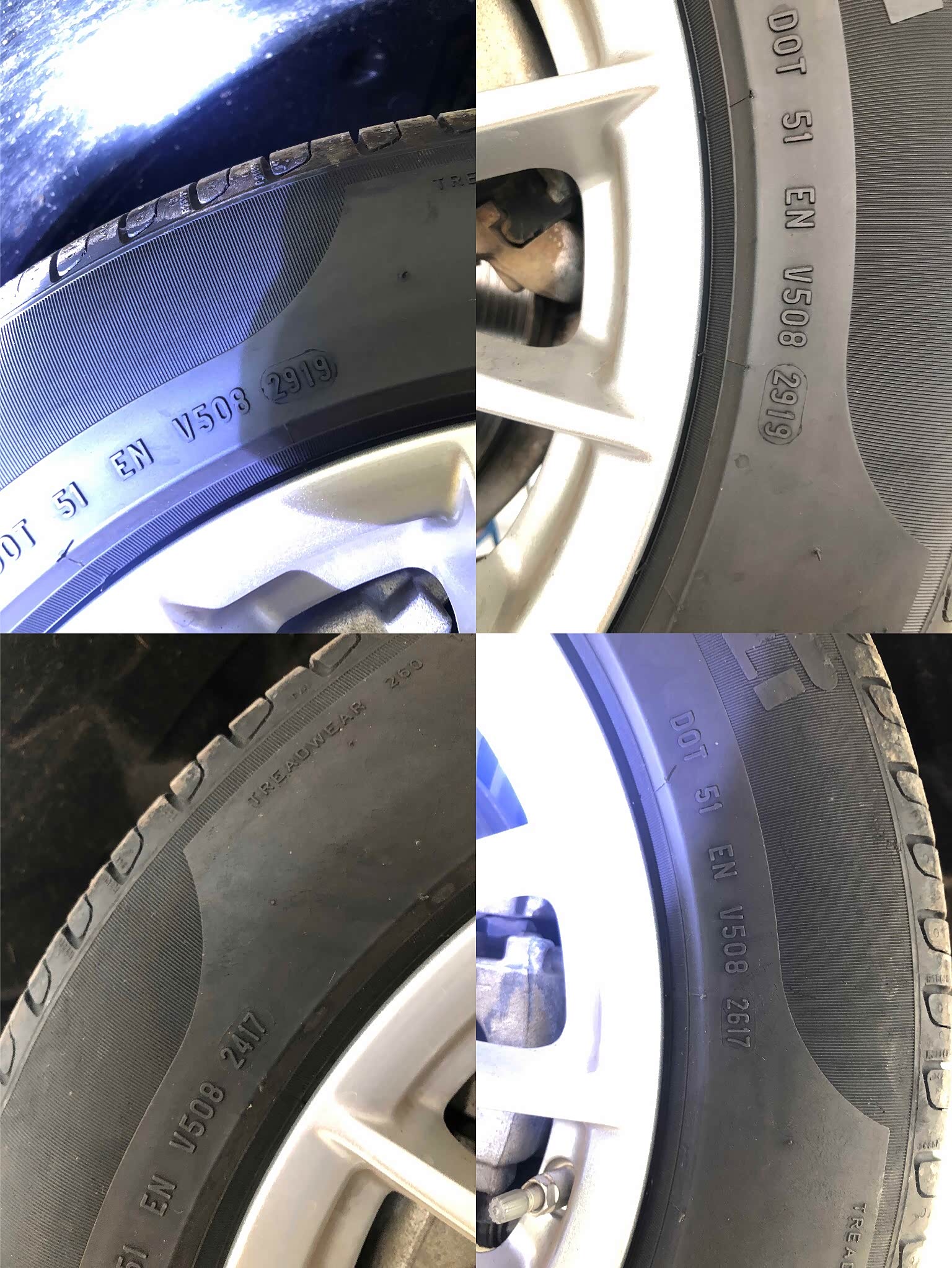 检测四轮轮胎前部两条轮胎均有过更换,后部两轮胎还是原厂胎,从胎纹来看还可以继续使用。