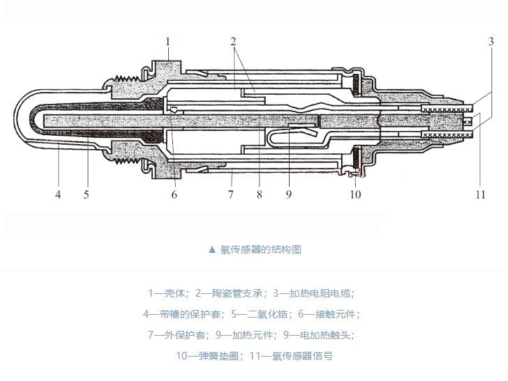 传感器的作用是测定发动机燃烧后的排气中氧是否过剩的信息,即氧气含量,并把氧气含量转换成电压信号传递到发动机计算机,使发动机能够实现以过量空气因数为目标的闭环控制。