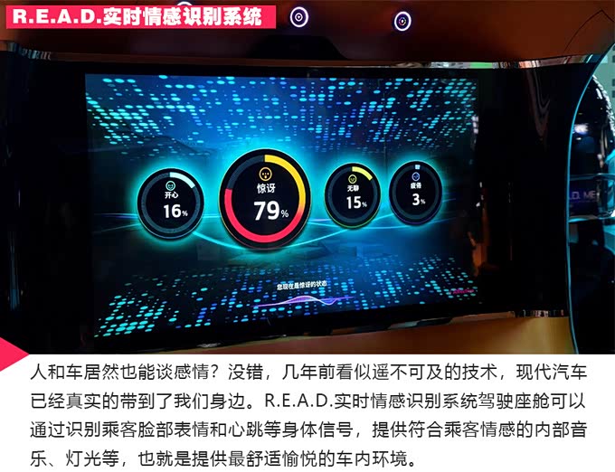 具体来讲,这套系统可以通过传感器感知乘客的面部表情、心率和皮肤电活动等,由乘客不同的情绪反应,调整车辆的各种参数。比如,可以根据情绪来调整车内氛围灯,当感知到乘客心情不好或者有些紧张的时候,可以调整车内温度到一个舒适的区间,并且可以释放香氛以缓解紧张感,系统还会自动调整音量,播放更容易缓解紧张感、焦虑感的音乐。当乘客心情愉悦的时候,通过音乐音响震动座椅的使用,配合音乐的播放,提供不同的座椅震动方式,让乘客有一种身临其境感。