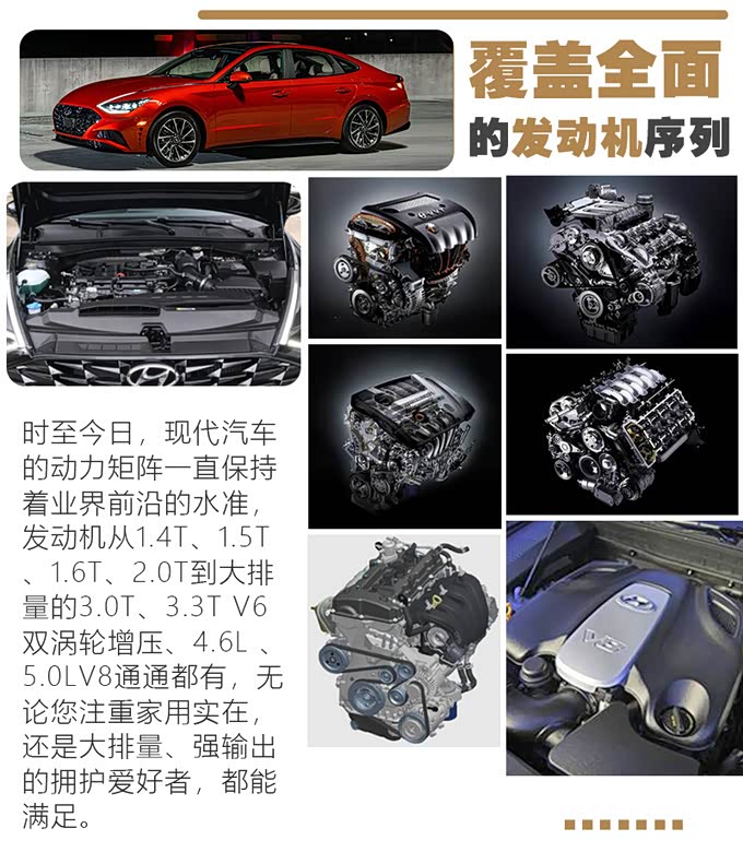随着技术的沉淀,时至今日现代汽车的发动机矩阵已经完全能覆盖所有人群对于动力性的需求,也就是说无论注重家用经济省油,还是想感受大排量自吸带来的爽朗感亦或是双涡轮增压的持续爆发满足感都能如愿。