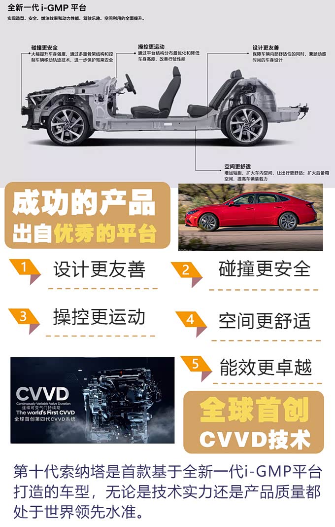 产品硬实力上,第十代索纳塔车身主要位置采用超高张力钢材和热冲压工艺,使平台平均强度提高10%以上;i-GMP平台的多重骨架结构发动机舱可以有效分散车体吸收的冲击力,在车身发生正面和小面积偏位撞击时,不仅最大限度降低对乘客的冲击力,还能减少对对方车辆的冲撞力度。