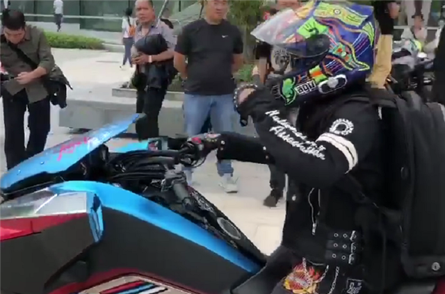 这样一台本田摩托车出现在街头,车主戴盔上牌,很守规矩。