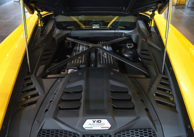 从四驱改成后驱后,这台车更加专注于操控感,也是玩车一族最喜欢的地方。从外观上看,这台车虽然和小牛接近,但前脸还是有一定区别的,比如大灯的设计不同,而且前脸增加了更加激进的导流槽,看上去非常的凶狠。从侧面看,这台车拥有兰博基尼最经典的车身造型,底盘非常的低趴,高度只有1165mm,标配19英寸的轮毂,刹车盘没有使用高端的碳陶结构,但看上去几乎分辨不出来。