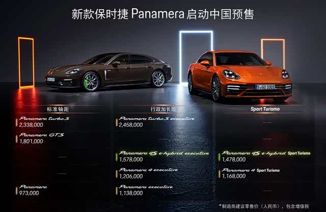 新款 Panamera 首批共发布 9 款车型,提供后驱和四驱两种驱动方式,以及燃油和插电式混动两种动力形式,同时覆盖标准轴距、长轴距和 Sport Turismo 三种车身形态,充分满足不同客户的个性需求,现已全面启动预售,预售价格区间为:97.3-245.8万元。