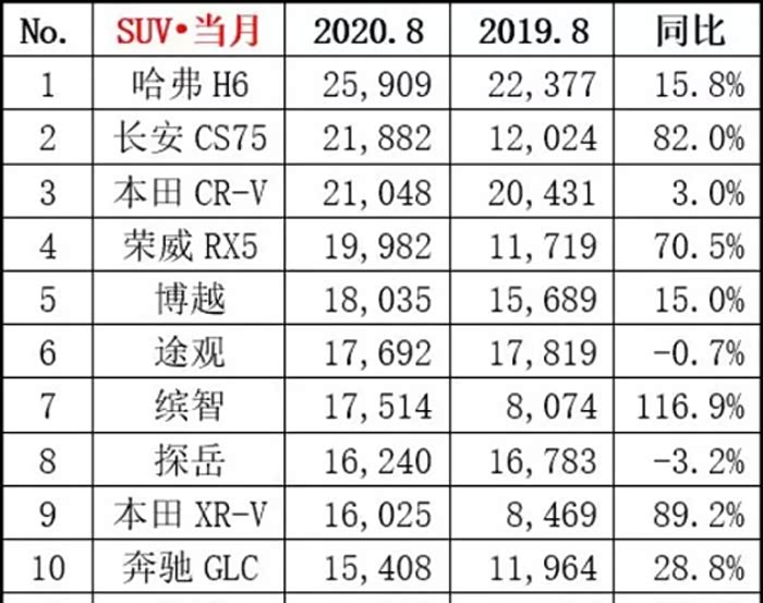说罢自主车和合资车后,速递哥再来和大家聊聊SUV的整体现状。从乘联会公布的8月份SUV销量前十名来看,自主车的占比为40%,合资车的占比为60%。除了排在第三名的CR-V外,第六名到第十名都是合资车,分别为途观、缤智、探岳和XR-V和奔驰GLC。虽然说,自主车形成了霸榜,但合资车仍然是自主车崛起的最大障碍。
