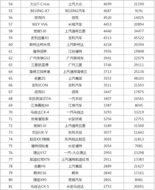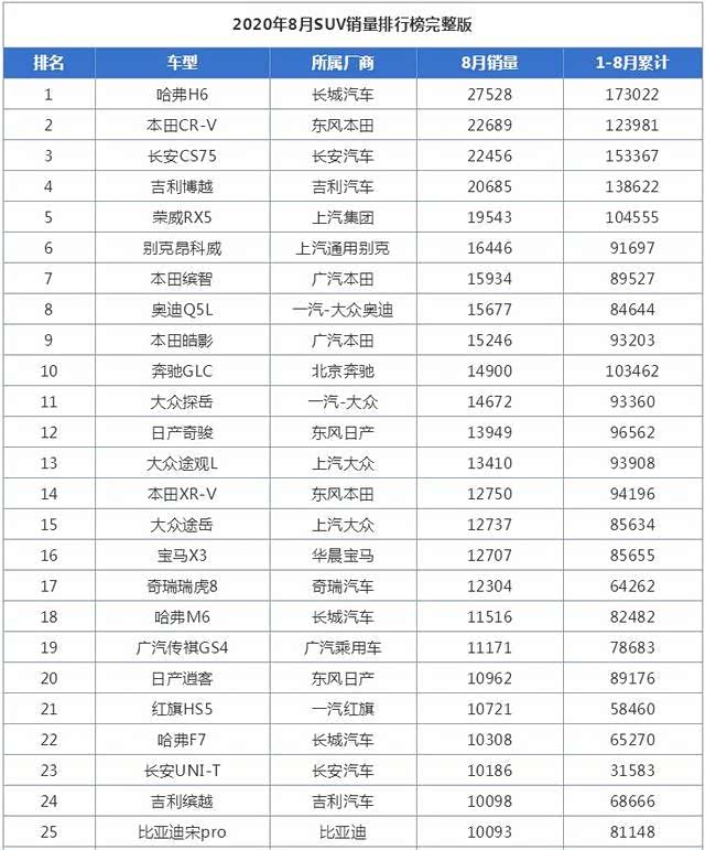 8月SUV销量排行榜,哈弗H6又第一,长安CS75跌至第三名