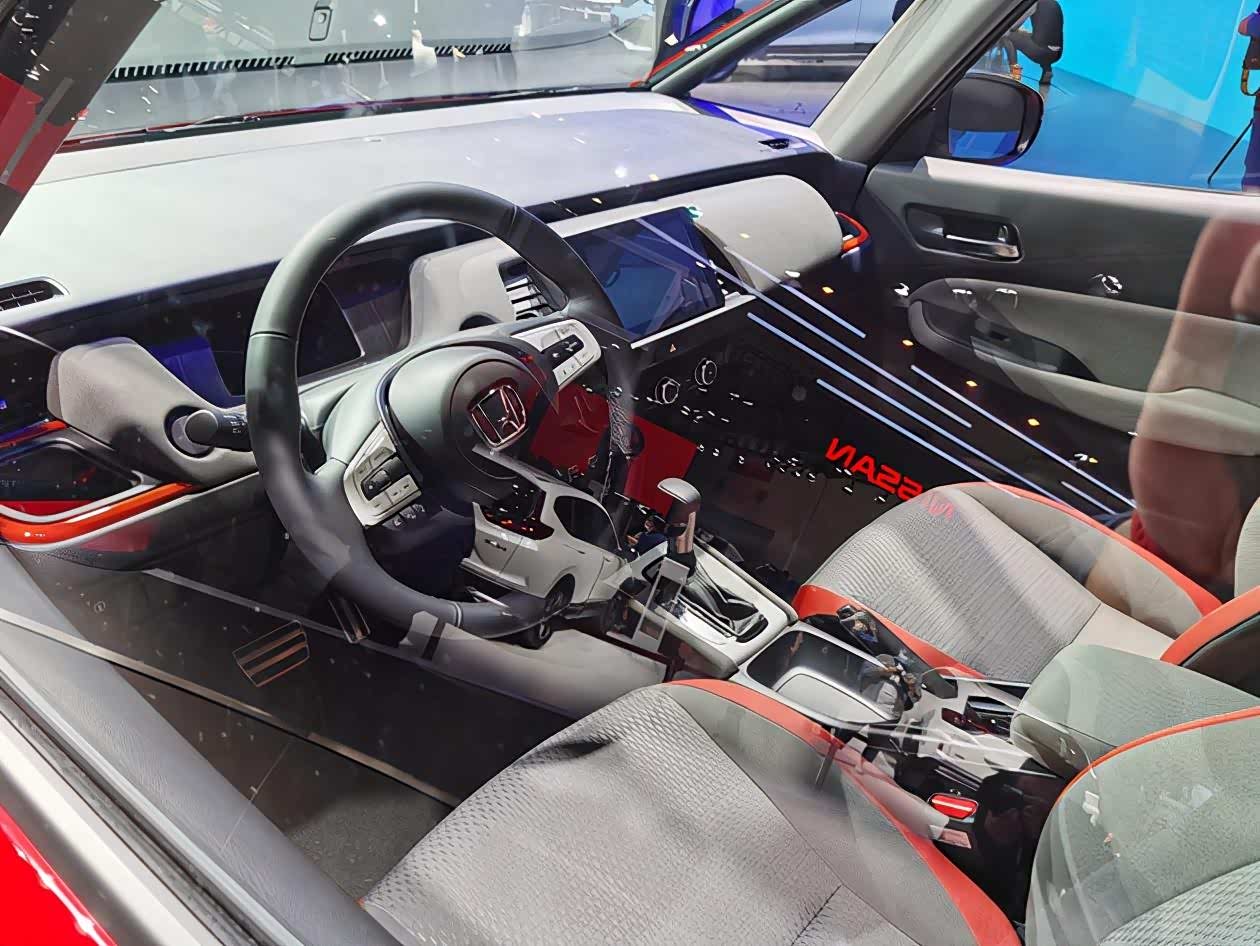 内饰方面由于东风本田还没有对外公布拍摄,所以我们是隔着玻璃拍的内视图,出来的效果也比较一般。我们可以看到,LIFE SPORT版是拥有中控大屏的,而飞度潮跑Pro没有配备大屏,在配置上来说,LIFE比飞度更高。