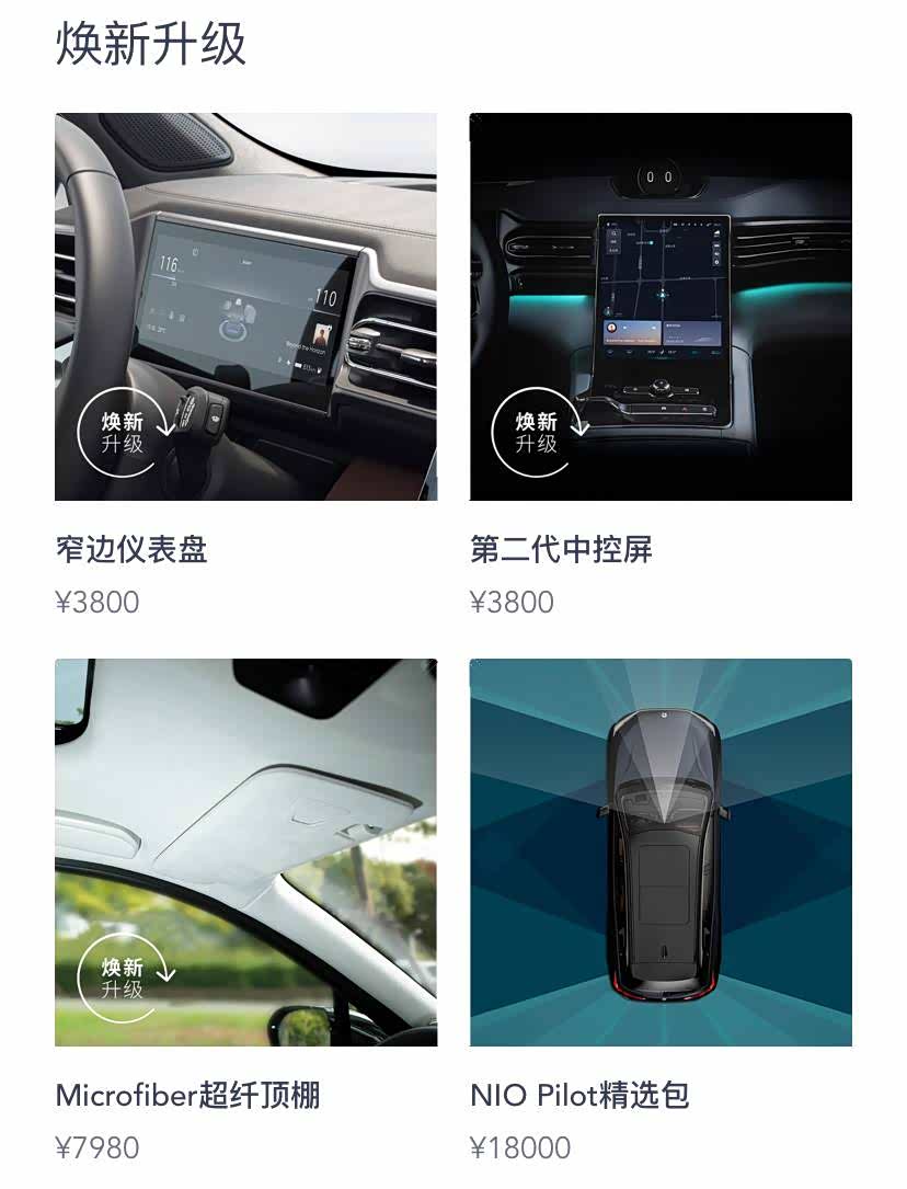 据了解,9.8 寸窄边仪表盘升级和第二代中控屏后装升级的价格均为 3800 元,其中,第二代中控屏在尺寸、分辨率和屏占比方面均有提升。而超纤绒顶棚升级的价格为 7980 元,但 ES8(参数|询价) 仅支持浅色升级,ES6则可以选择同色升级。