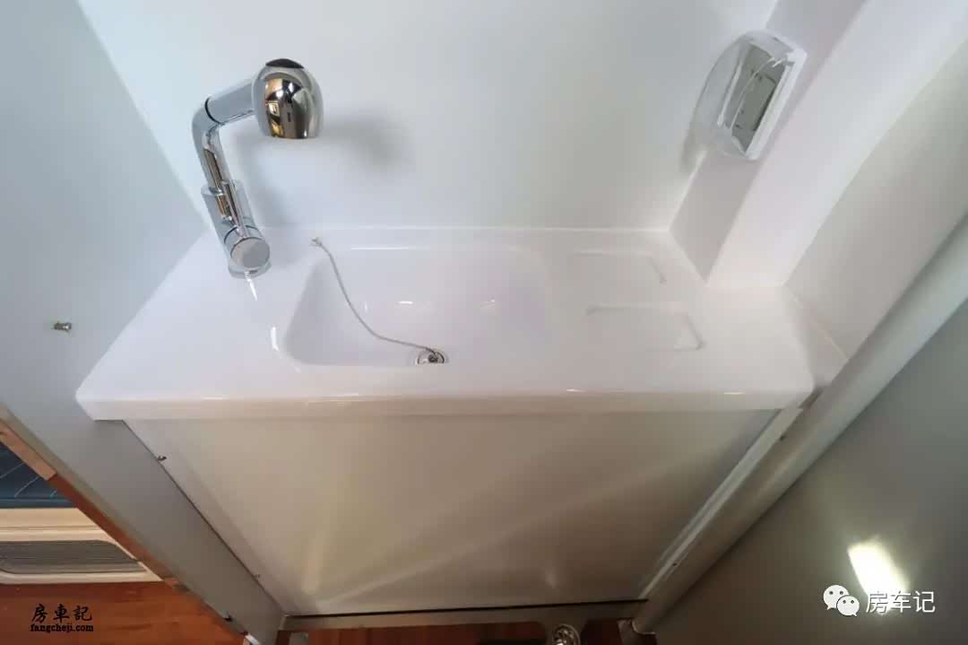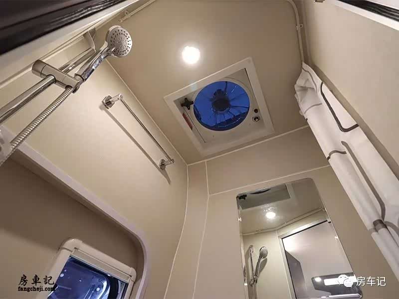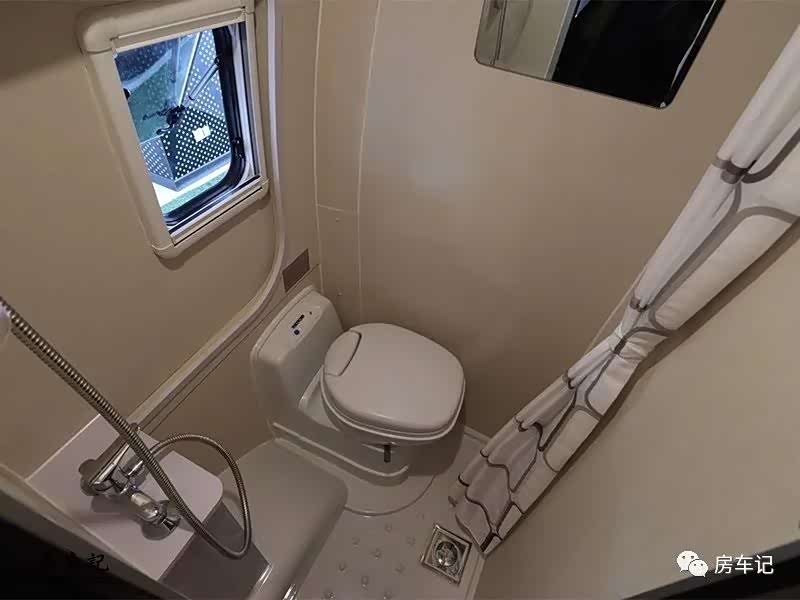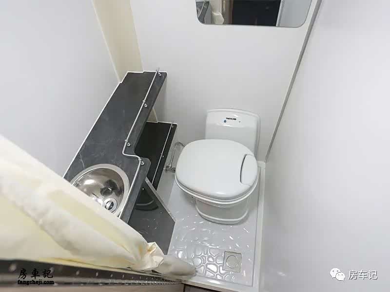 卫生间配置:卫生间区域也是做到了在B型房车的领域非常实用强大的空间和功能。里面配有独立花洒和塞特福德可旋转马桶,顶部配有化妆镜,毛巾架和换气扇。不拥挤的内部空间和非常完善的功能配合的非常好。房车水路标配120升净水箱,60升污水箱。
