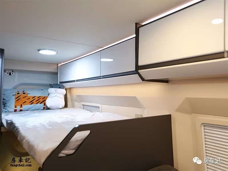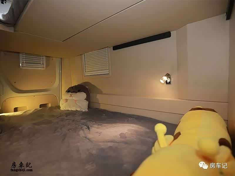 上铺为电动升降床铺,不需要使用的时候升至顶部不占用车内的空间。车内可满足两人使用。也可以说是完全为2人出行打造的小房车。