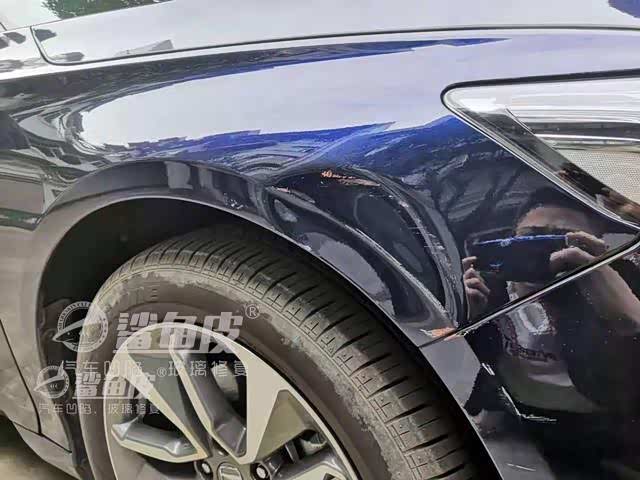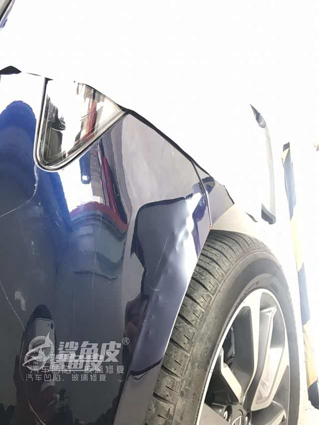 这是我们成都店今年3月份碰到的一个客户,他就是碰上了个新手师傅,好好的一个坑差点被修废了。这是一辆雅阁,上面贴有车衣,拐弯的时候不小心刮凹陷了,但是油漆一点事都没有。结果碰到个学徒给他修的,顶的全是大尖子,万幸油漆没有顶裂,后来给我们成都店长再修复了一次给抢救回来了。
